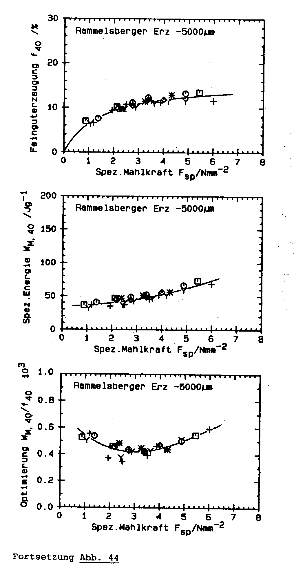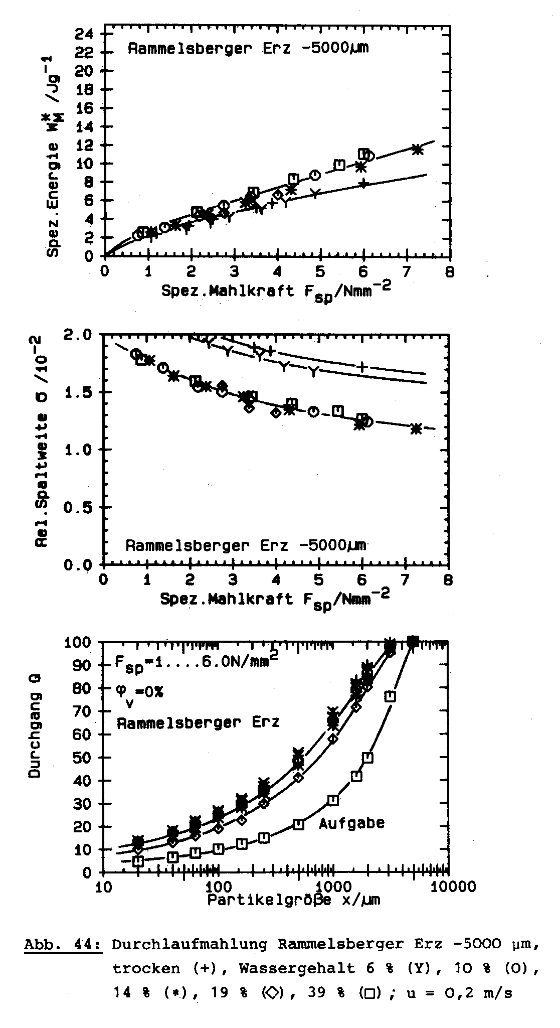 This page as well as the following web pages show the results of Schwechten [2] of single pass grinding tests with limestone, quartz, Rammelsberg ore and cement clinker as well as a simulated closed circuit grinding test with Kieserit at variation of feed size, moisture content and roller speed.