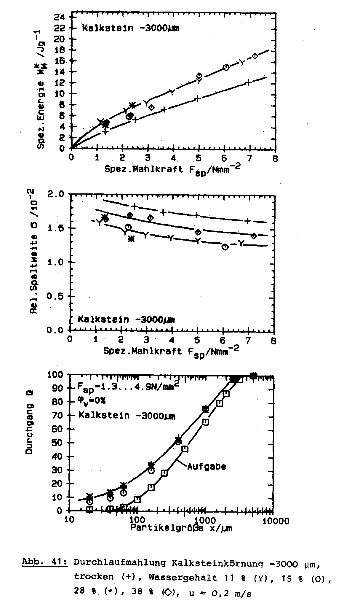 This page as well as the following web pages show the results of Schwechten [2] of single pass grinding tests with limestone, quartz, Rammelsberg ore and cement clinker as well as a simulated closed circuit grinding test with Kieserit at variation of feed size, moisture content and roller speed.