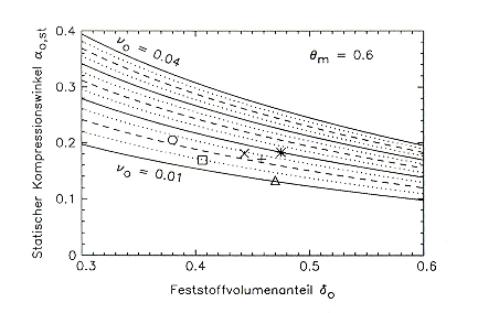 Set of characteristic curves for n0 and averaged (a0;n)-pairs from compression tests: quartz ^ 0.5/1.0 [] 1.0/2.0 o 4.0/6.0 mm limestone + 0.5/0.8 mm x 1.2/1.8 mm * 4.0/6.0 mm |