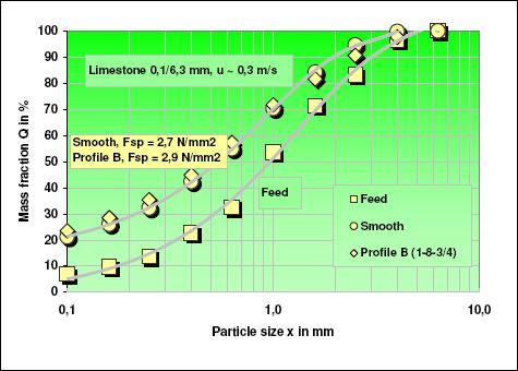 But at the same level of specific grinding force the comminution effect may depend on the roller surface structure. In the diagram below the product particle size distributions for a coarse quartz graining 1,6/6,3 mm after a stressing with 2,3 N/mm² respectively 2,8 N/mm² with smooth and moulded rollers are compared. With profile B the grinding effect is lower but the throughput of 5,3 t/h is much higher than the throughput of 2,0 t/h with smooth rollers.The energy absorption which is resulting out of this is 4,1 J/g for moulded and 8,2 J/g for smooth rollers. |