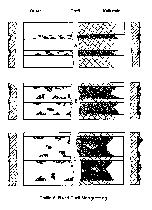 profile B (1-8-3/4) after grinding a limestone grinding 0,1/6,3 mm.In the second sketch the conditions for different roller profiles and materials are shown. The observations show the following tendencies: