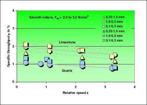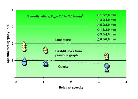 Specific throughput of quartz and limestone, smooth rollers, coarse