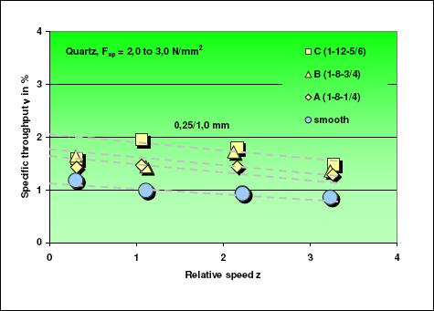 Specific throughput quartz 0,25/1,0 mm with different roller profiles / Dissertation Lubjuhn, 1992 [25]