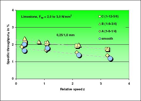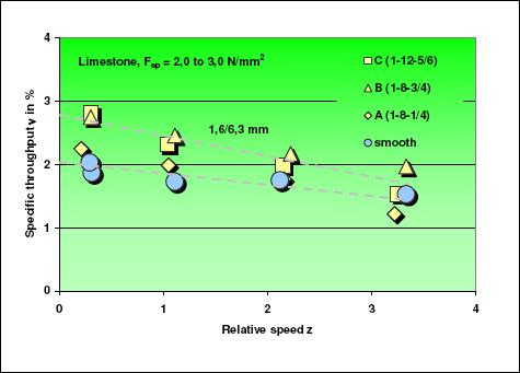 Specific throughput limestone 0,25/1,0 mm with different roller profiles / Dissert. Lubjuhn, 1992 [25]